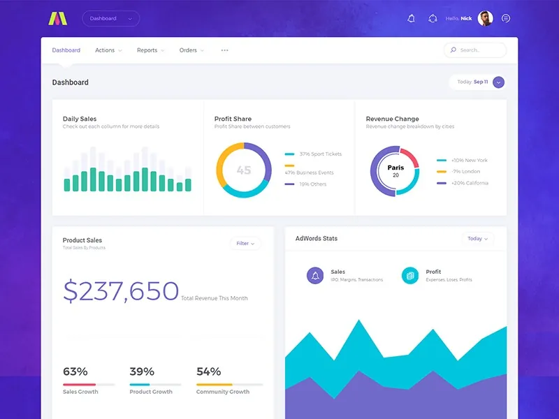 Excelente combinación de tipografía y gráficos, además de un excelente menú con alta usabilidad en este admin dashboard.
